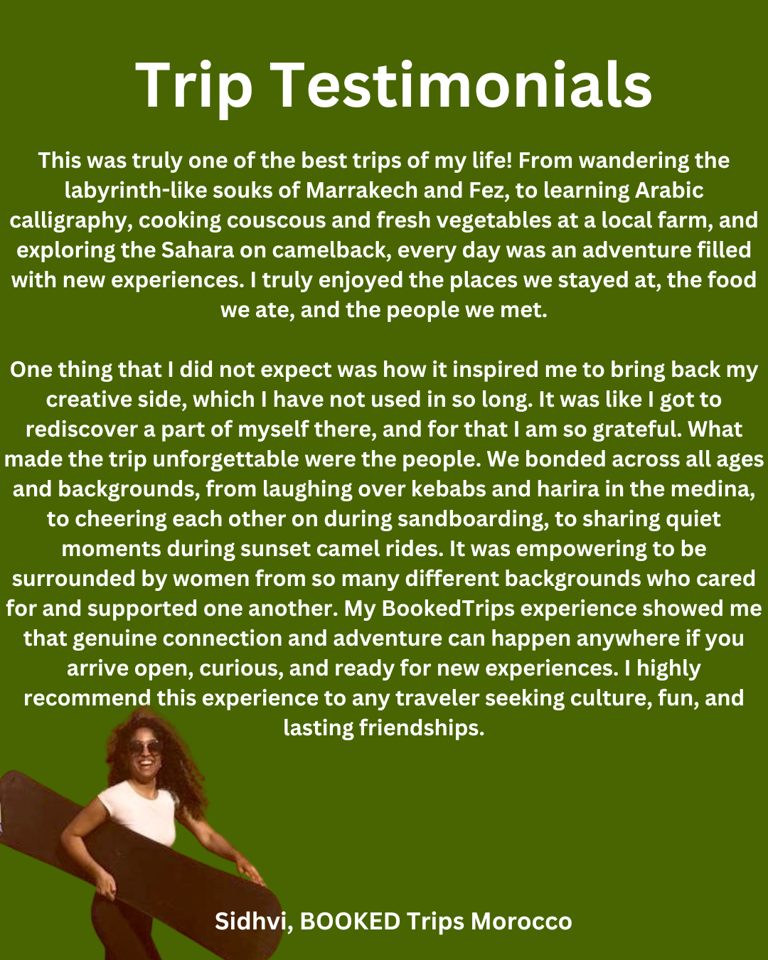 - SUPPORT LOCAL ENTREPRENEURS – Our travels are carefully crafted to benefit the communities we explore, prioritizing partnerships with Black, brown and indigenous local experts. When you choose BOOKED Trips, you’re traveling with purpose and contributing to the local economy.